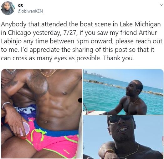 Authorities in Chicago are currently in search of a 30-year-old Nigerian man, Oluwafemi Arthur Labinjo, who ''vanished'' while he was boat cruising with his friends in Lake Michigan on Saturday July 27th.